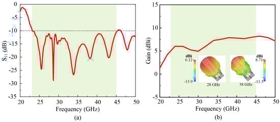 The performance characteristics of the dipole array antenna: (a) the reflection coefficient, and (b) the gain and 3D directivity at 28 GHz and 38 GHz.