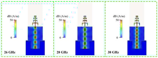 The surface current distribution of the dipole array antenna at different operating frequencies is also shown in Figure 4. It can be observed from the current distribution graph that the lower resonances are generated by the longer arms. At 26 GHz, the lower arms show a high level of current density. Similarly, the shorter arms are responsible for the higher band resonances. At 28 GHz, the middle arms show increased current density. Meanwhile, at 38 GHz, the highest current density is observed in the shortest arm of the dipole array.