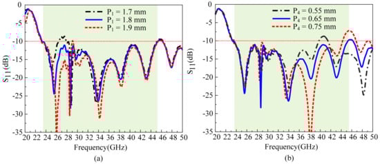 A parametric study of the array dipole antenna is presented in Figure 5 only for the parameters P1 and P4 to show the controllability of the reflection coefficient of the designed antenna. It can be observed from the parametric study graph in Figure 5 that by controlling the P1 parameter, the resonance at the lower band can be controlled, and by controlling the P4 parameter, the upper operating frequency band can be controlled. Similarly, by controlling the other parameters of the dipole, the resonance of the antenna can be changed or improved.
