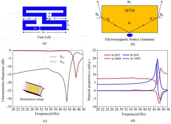 The metamaterial structures have the ability to interact with the electromagnetic waves of any antenna and change the antenna’s radiation performance [30]. As the dipole antenna alone offers a very low average gain of 6.7 dBi with a maximum peak gain of 8.1 dBi, a novel metamaterial structure is proposed to enhance the gain of the designed dipole antenna by boosting radiation directivity. Initially, a unit cell is developed for the targeted frequency spectrum. Afterwards, the unit cell is copied and translated to design the proposed metamaterial structure. The simulation setup and results of the designed unit cell, along with its dimensions, are presented in Figure 6. The dimensions of the developed unit cell are shown in Figure 6a, and the parametric values are listed in Table 2. Additionally, the working principle of the metamaterial is illustrated in Figure 6b, where ni and n0 represent the refractive index in the substrate and air, respectively. Snell’s law states the relation between ni and n0, as presented in Equation (1):
