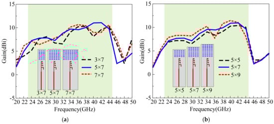 After achieving a good response from the metamaterial unit cell for the targeted frequency band, the proposed metamaterial structure is employed at the top side of the dipole array, at both the front and back side, as presented in Figure 7, to enhance the performance, particularly in terms of high gain. The dipole array antenna is evaluated with a different number of unit cells for the best gain performance. Figure 8 contains the gain response of the dipole antenna with a different number of metamaterials. While Figure 8a shows the gain response of the variation in the cells in the horizontal position, Figure 8b presents the gain response of the varying cell numbers in the vertical arrangement. It can be observed from the gain graphs that the proposed 5 × 7 metamaterial structure offers the best gain performance, with a maximum gain of 11.21 dBi. The minimum and maximum gain responses of different metamaterial cell arrangements along with their corresponding frequency responses are presented in Table 3.