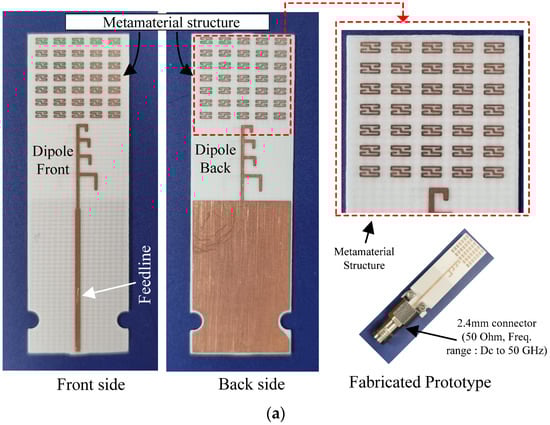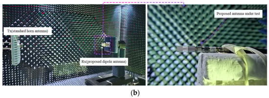 The performance parameters of the proposed metamaterial-based array dipole antenna are presented in this section. All of the antenna performance parameters, including the reflection coefficient, radiation characteristics, radiation efficiency, and gain, are suitable for wideband 5G NR millimeter-wave applications. The fabricated antenna prototype is shown in Figure 9a, while Figure 9b contains the measurement setup in an anechoic chamber [37] used for the antenna’s radiation characterization. The S-parameters of the proposed metamaterial-based dipole antenna are measured in a normal environment using the Keysight E8364B PNA network analyzer. The far field is measured in an anechoic chamber, as shown in Figure 9b, while a horn antenna with standard performance is used as the transmitting antenna, and the proposed antenna receives the signal as a receiver.