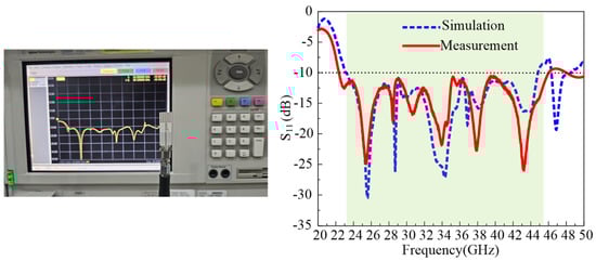 The reflection coefficient characteristic of the proposed metamaterial-based array dipole antenna is displayed in Figure 10. The proposed antenna offers a wide operating bandwidth from 23.1 GHz to 44.8 GHz. With an Agilent E8364B network analyzer in open-air, ambient settings, the S-parameters of the recommended antenna are measured. As seen in Figure 10, the slight difference between the simulation and measurement results is caused by cable/connector losses. A very broad impedance bandwidth of 63.92% (S11 ≤ −10 dB) is provided by the recommended antenna between 23 GHz and 45 GHz. The proposed bandwidth spans the whole n257, n258, and n259 frequency ranges as well as the n260 and n261 frequency bands for 5G NR millimeter-wave communication, which is recommended by the Third Generation Partnership Project (3GPP) and the ITU.