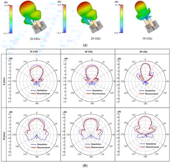 Figure 11 illustrates the radiation pattern of the proposed metamaterial-based non-uniform dipole array antenna at different frequencies. While the 3D directivity pattern at 26 GHz, 28 GHz, and 38 GHz is presented in Figure 11a, the 2D polar radiation gain pattern is presented in Figure 11b. It can be seen from both simulated and measured radiation pattern graphs that the antenna offers an end-fire radiation characteristic. Due to the equipment losses during measurement, there is a slight mismatch between the simulated and measured results. The presented antenna yields a maximum gain of 11.21 dBi at 41 GHz, with 30.7° and 43.4° half-power-beam widths (HPBWs) at the E and H planes, respectively. The HPBW of the presented antenna at different frequencies is listed in Table 4, and the gain plot of the proposed antenna with respect to frequency is presented in the subsequent subsection, where the gain and radiation efficiency are explained. Additionally, the proposed antenna shows a side-lobe level less than −6 dB within the operating frequency band, which makes the proposed antenna suitable for the MIMO configuration for 5G technology.