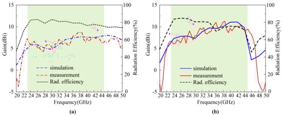 Simulated and measured gain, and radiation efficiency performance: (a) antenna without metamaterial structure and (b) antenna with metamaterial structure.