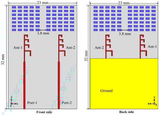 This antenna provides broadband operation with stable gain and end-fire radiation. However, this work is limited to the exploration of a single-element design. For future communications, multiple-input multiple-output (MIMO) configurations are essential. To check the suitability of an MIMO configuration of the proposed metamaterial-integrated antenna, a two-port MIMO antenna is designed, as shown in Figure 13. Subsequently, the MIMO performance is studied. The distance between the two single antennas is kept as low as 3.8 mm.