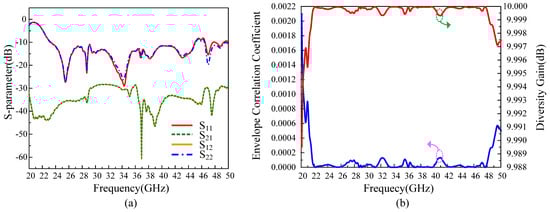 The results of the MIMO configuration of the proposed antenna: (a) S-parameters and (b) the ECC and DG.