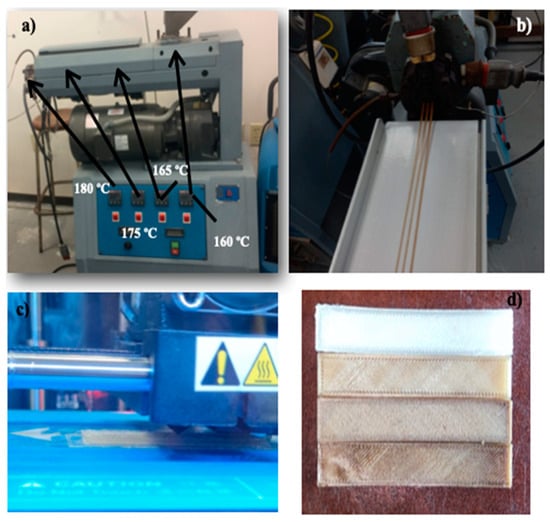 Scheme of process for obtaining 3D-printed specimens: (a) extruder with temperatures, (b) filaments obtained by extrusion, (c) 3D printing, (d) obtained 3D-printed composites.