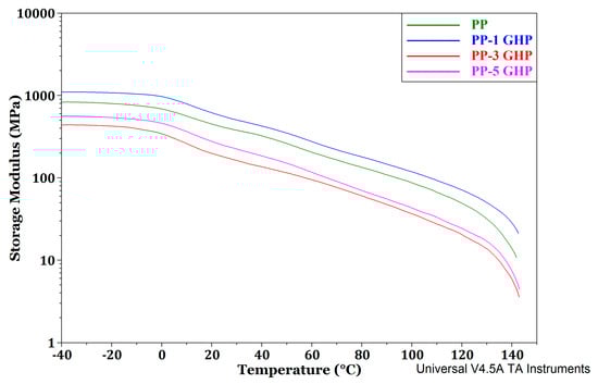 DMA thermogram of storage modulus versus temperature for 3D-printed PP and PP-GHP composites.