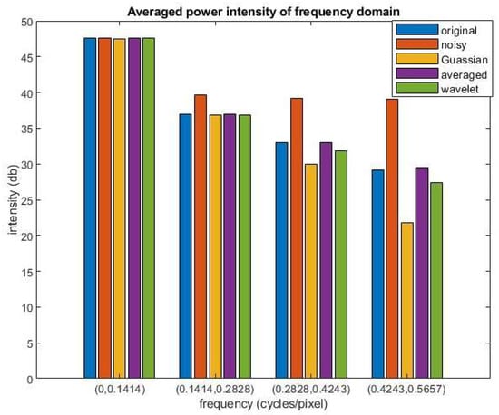 Figure 4 shows the image generated from the Gaussian filter has a lower power intensity than that of the original image with high frequency, which indicates that a lot of high-frequency data in the original image has been filtered out as well. Although it performs better than a Gaussian filter, the wavelet filter still loses some details of the original image. Only the averaging method can reduce the noise level and retain all the information.