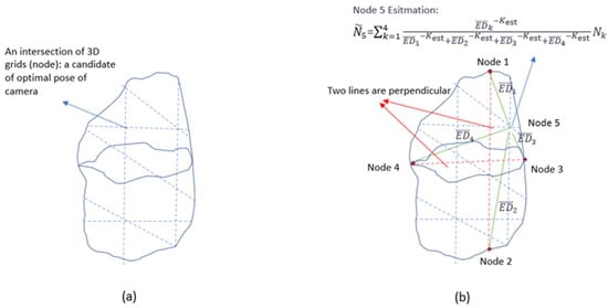 (a) The operational space of the camera is an arbitrary closed 3D geometry in the space shown in the plot. The gridded area is in 3D (blue dashed lines). (b) Four initial nodes are chosen so that their connection lines (red dashed line) are perpendicular. The picture number of Node 5 can be estimated by Equation (4) from four initial explored nodes. represents Euclidean distance (green line).