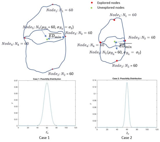 Both case 1 and case 2 have the same estimated value of an unexplored node (green point) from Equation (4). However, the node in case 1 has a larger distance to explored nodes (red points) compared to that in case 2. Therefore, we set different standard deviations ( > ) to differentiate possibility distributions. This approach distinguishes nodes that have the same estimations from Equation (4) to have different likelihoods to be explored in the next iteration.
