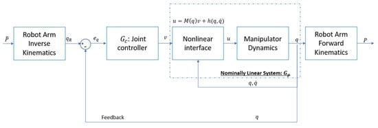 Various controller designs, such as the PID controller [32] and Youla controller [33], of 6-DoF revolute robotic manipulators have been well developed in many papers. In this paper, we use a previous Youla controller design [33] with feedback linearization (Figure 9) as the position controller of the robot manipulator that holds the camera.
