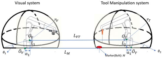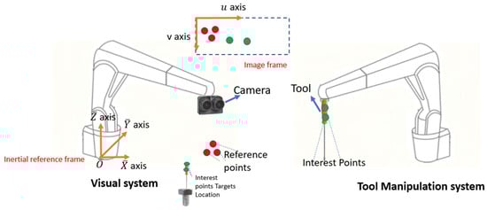 According to the relative positions between cameras and the tool manipulators, visual servoing can be generally divided into two categories: eye-in-hand (EIH) configuration and eye-to-hand (ETH) configuration [8,9]. In EIH, a camera is mounted directly on a robot manipulator, in which case the motion of the robot induces the motion of the camera, while in ETH, the camera is fixed in the workspace and observes the motion of the robot from a stationary configuration. Both configurations have their own merits and drawbacks regarding the field-of-view limit and precision that oppose each other. EIH has a partial but precise view of the scene, whereas ETH has a global but less precise view of it [10]. For complex tasks in automated manufacturing, one configuration of visual servoing is inadequate as these tasks require the camera to provide global views and be maneuverable enough to explore the scene [10]. To take advantage of both stationary and robot-mounted sensors, two configurations can be employed in a cooperative scheme, which can be seen in some studies [11,12,13].