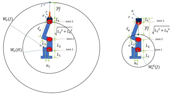 Inverse kinematics refers to the mathematical process of calculating the variable joint angles needed to place the end-effector in a given position and orientation relative to the inertial base frame. Equations (A6)–(A13) are summarized below: