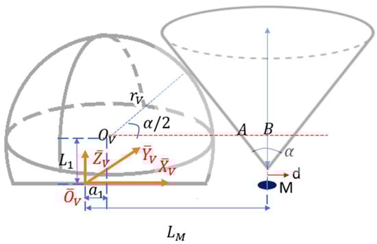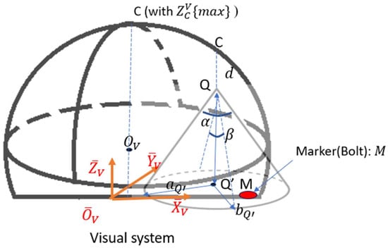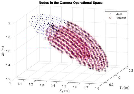 A camera, mounted on a 6-joint robot manipulator, moves freely in 6 degrees of freedom (6 DoFs) in space. Assuming the camera is fixed in orientation towards the face of the object of interest, only the position (3 DoFs) of the camera can vary from the movement of the robot arm. The camera can only move to the locations within the maximum reach of the robot manipulator, and the object can only be detectable within the view angle of the camera. These constraints create a camera operational space (Figure 6a), which is then gridded with a certain resolution of distance. All the intersections of grids come up with a set of nodes (), which are all possible candidates of locations that the camera may move and search utilizing the algorithm. Each node is indexed and denoted as .