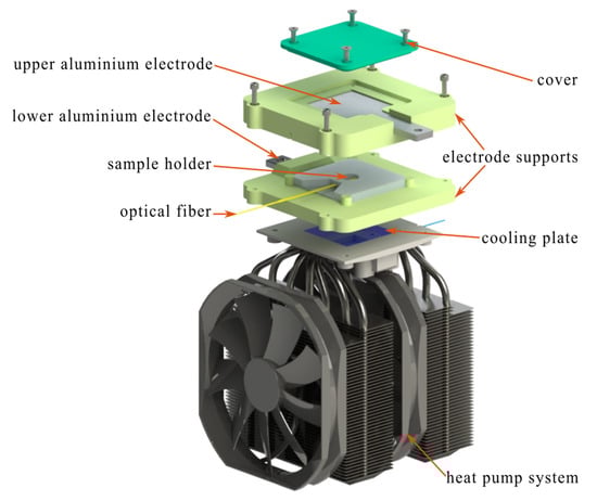 Diagram of the experimental design applied in the electrofreezing investigation. Deionized water was placed in the sample holder and the lower electrode was cooled using a cooling plate through the Peltier effect.