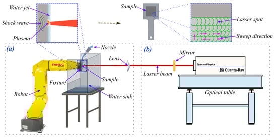 LSP treatment application process on Al6061 T6 electrodes: (a) motion generation by robot, (b) laser generation module.