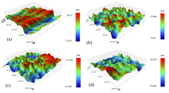 Profile mapping of the initial Al6061 alloy surface (a) and after LSP, (b) 900 pulses/cm2, (c) 1600 pulses/cm2, and (d) 2500 pulses/cm2.