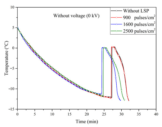 Figure 7 shows four typical temperature–time curves that were obtained during the cooling experiments of 1 mL of deionized water. The curves correspond to experiments performed before the application of voltage using an electrode without the LSP treatment (black line), an electrode treated with LSP with 900 pulses/cm2 (red line), an electrode treated with LSP with 1600 pulses/cm2 (blue line), and an electrode treated with LSP with 2500 pulses/cm2 (green line). All curves start their cooling at 5 °C and then they present a very similar cooling slope between them without any apparent effect due to the different pulse densities of the LSP treatment applied on the electrodes. Subsequently, the curve of the experiment with the electrode without LSP presents a nucleation temperature of −12.04 °C, while the curve of the experiment with the electrode with LSP with a density of 900 pulses/cm2 presents a nucleation temperature of −12.34 °C. On the other hand, the experiment with the electrode with a pulse density of 1600 pulses/cm2 showed a nucleation temperature of −11.25 °C, and finally, the nucleation temperature of the experiment with the electrode with the LSP treatment with a pulse density of 2500 pulses/cm2 was −11.88 °C. The freezing temperature of the deionized water during the four experiments was close to 0°. Figure 8 presents the cooling curves from the electrofreezing experiments conducted with electrodes that did not undergo the LSP treatment. It was observed that the nucleation temperature increased with the applied voltage, exhibiting a generally linear trend across the range of voltages tested. Figure 9 shows the cooling curves for the experiments using electrodes treated with 900 pulses/cm2. In this case, the nucleation temperatures exhibited a significant shift to higher values compared to the untreated electrodes, including the temperature at 5 kV, which reached −7.623 °C—slightly higher than that of the untreated electrode. Figure 10 displays the cooling curves for the electrofreezing experiments with electrodes treated with 1600 pulses/cm2. In this case, the shift towards higher nucleation temperatures was significant compared to the untreated electrodes. This shift was as pronounced as the shift observed with the 900 pulses/cm2 treatment. Figure 11 presents the cooling curves for the experiments using electrodes treated with 2500 pulses/cm2 under increasing voltage. The shift towards higher nucleation temperatures was less pronounced than those observed with the 900 and 1600 pulses/cm2 treatments but was still greater than in the untreated electrodes. The approximately linear increase in nucleation temperature with applied voltage in the untreated electrodes can be attributed to the uniform electric field distribution across their smooth surfaces, which likely does not significantly disturb the molecular structure of the water. In contrast, the LSP-treated electrodes introduce evident microstructural (e.g., increased roughness, sharp peak formation, wave-like micro-regions) and crystalline features such as the texturing in the (111) direction of the Al6061 T6 alloy electrodes that disrupt this uniformity, potentially creating localized electric field enhancements that may either facilitate or inhibit nucleation, depending on their configuration and interaction with water molecules.
