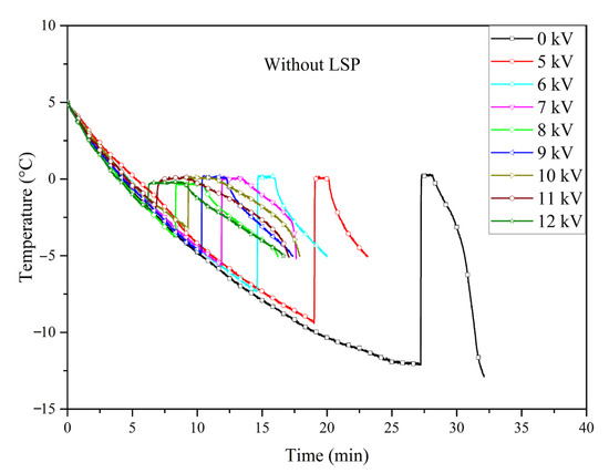 Cooling curves of the electrofreezing experiments using electrodes without treatment with increasing high voltage.