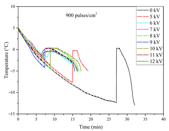 Cooling curves of the electrofreezing experiments using electrodes with 900 pulses/cm2 with increasing high voltage.