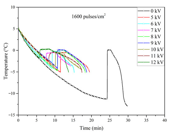 Cooling curves of the electrofreezing experiments using electrodes with 1600 pulses/cm2 with increasing high voltage.