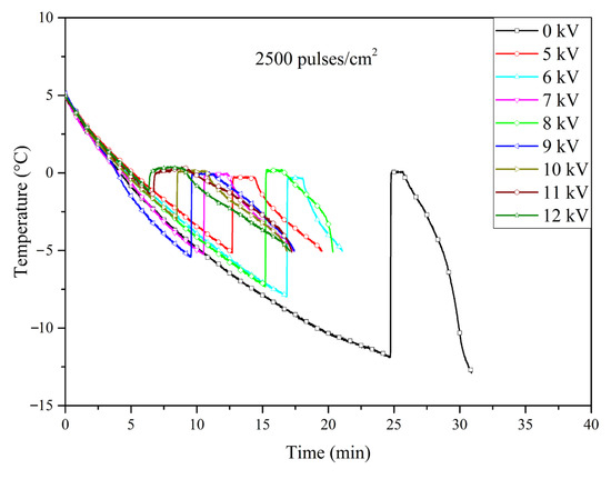Cooling curves of the electrofreezing experiments using electrodes with 2500 pulses/cm2 with increasing high voltage.