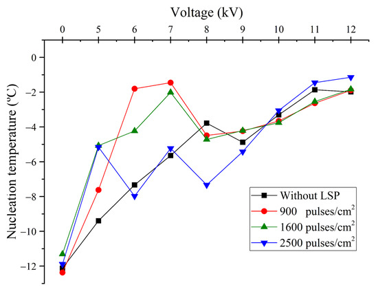 4.3. The Effect of the LSP Treatment with Different Pulse Densities on Nucleation Temperature as a Function of High DC Voltage