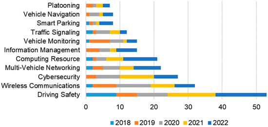 The SME classification resulted in the 11 distinct topic areas summarized in Table 1. The table lists each topic and describes the general types of problems addressed within that category. Figure 1 shows a distribution of these topic areas by year. The literature review revealed that safety and security are broad aims of CV technology, and these align with the SME classified topics. Traffic flow efficiency, another broad aim, includes topics such as traffic signaling, information management, vehicle monitoring, vehicle navigation, smart parking, and platooning. Topics focused on wireless communications and allocating vehicular computing resources enable the efficient deployment of CVs. The notable concentration in cybersecurity-related patents indicates a trend toward prioritizing security in CV development. The SME observed that every topic had overlapping objectives. For example, advancements in traffic signaling and multi-vehicle networking can improve both driving safety and the efficiency of traffic flows. Therefore, the SME assigned the dominant topic to each patent summary.