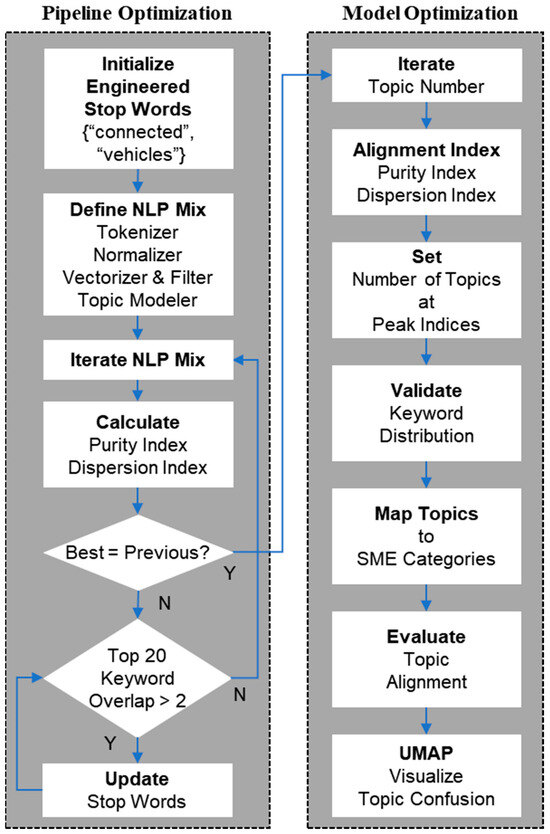 Subsequent subsections describe the process of finding the best NLP pipeline, topic model optimization to find the optimum number of topics, and an assessment of the confusion in topic model assignments relative to the SME-assigned categories.