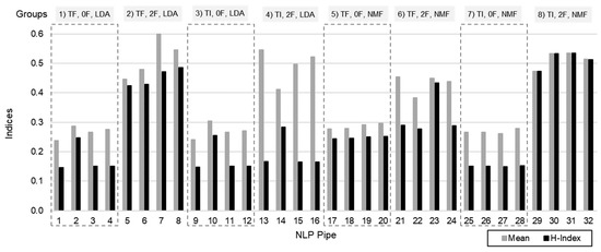 Table 4 summarizes the performance of each NLP pipeline in terms of their alignment index components and the H-index. There were four combinations of tokenizers (T) and normalizers based on the best algorithms identified in Table 2. The NLP pipeline included a mix of the CountVectorizer measuring term frequency (TF) and the TfidfVectorizer measuring TF-IDF (TI), each with options for no filtering (0F) and dual filtering (2F) of extreme importance values. The NLP pipeline included combinations of the LDA and NMF topic modelers. Hence, there were 4 (tokenizer/normalizer) × 2 (vectorizers) × 2 (filters) × 2 (topic modelers) = 32 combinations of NLP algorithms in the NLP pipeline. The results show that NLP pipeline 31 yielded the best H-index.