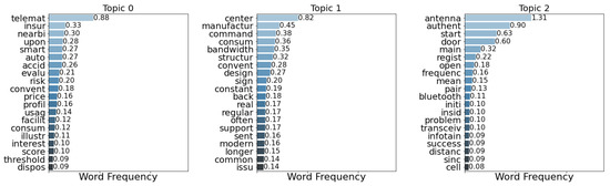 The topic modeling algorithms require cleaned text to provide the best results. Hence, the text cleaning procedure removed noisy text, including characters and words with little or no meaning. These included punctuation marks, numbers, and short tokens such as those containing at most three characters. The field of NLP defines stop words as those that contribute little or no meaning towards understanding a sentence. Common English stop words are they, which, that, were, having, doing, while, and from. Initially removing short tokens such as the, a, an, in, on, at, or and reduces the size of the corpus to speed up the removal of longer stop words, including words that are specific to patent documentation. For example, words commonly used in patent documents are system, method, embodiment, invention, disclosure, claim, provide, describe, and include. In this analysis, the words connected, vehicle, and vehicles were stop words because they must appear in all documents, by definition of the search keywords.