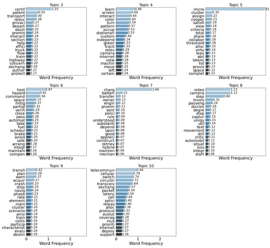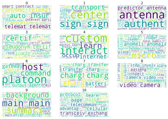 Figure 6 complements Table 5 and Figure 5 by showing a word cloud for each of the model-assigned topics. To improve visualization, the font sizes correspond to the TF of the keyword distributions rather than the TI-IDF values. The visualization shows both distinct and overlapping topics. For example, topic 6 is clearly about vehicle platooning, whereas topic 9 includes a mix of topics based on words such as transit, warn, crash, navigate, and cluster.
