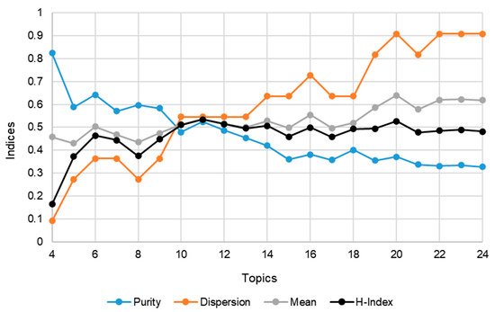 where is the count of the model’s most frequently assigned topic for SME category i and Di is the number of documents in SME category i. The maximum purity factor is unity when the most frequently assigned topic in an SME category covers all documents in that category, making it a pure assignment. The minimum purity factor is 1/C where , reflecting that no two assigned topics in an SME category were identical. The average purity factor mirrors a homogeneity measure of clustering, which is a global measure of the number of predicted classes that belong to the same cluster [39].