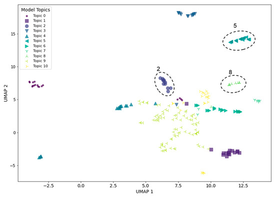 The topic modeling output is a matrix of documents (rows) and topic probabilities (columns) that represent the mix of all topics in a document. However, the topic assigned to a document is the one with the highest probability. Similar probability vectors of topic assignments will cluster in feature space. However, it is not possible nor practical to visualize clusters of documents, each with 11 topic probabilities or features. Fortunately, uniform manifold approximation and projection (UMAP) is a technique used to visualize high-dimensional data in two-dimensional space by embedding features in a manner that preserves their original structure and relationships [40].