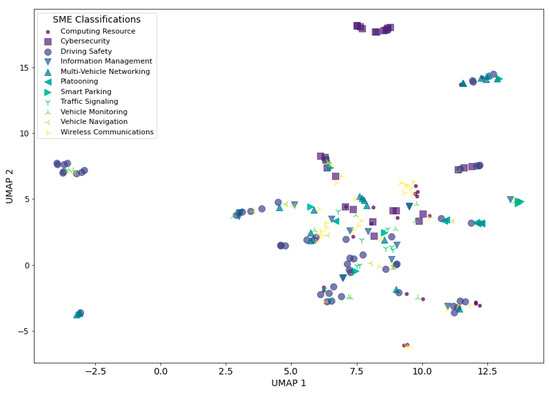 Figure 8 shows the UMAP of topic model probabilities, labeled by the topic model assignments. It is evident that the document clusters reflect the maximum probability topic assigned. The chart also reveals how documents contain a mix of topics because they form overlapping clusters, such as near the coordinates (7.5, 5.0). As highlighted by the dotted line boundaries shown, clusters such as topic 2, topic 5, and topic 8 are more isolated and homogeneous in topic mix. Figure 9 labels the UMAP of these topic model probabilities with the SME topic assignments to highlight the misalignment between model-assigned and SME-assigned categories. It is clear from the chart that even the remote clusters are no longer homogeneous.