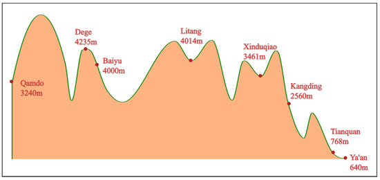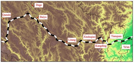 The southwest railway, as shown in Figure 1, is situated on the margin of Qinghai-Tibet Plateau and crosses various geomorphic units, such as a high mountain and gorge area, western Sichuan high mountain and plain area, and the core area of the Hengduan Mountains high mountain and gorge. The section starts from Ya’an and passes through Kangding, Litang, Dege, and other places before reaching Qamdo. The length of the railway is about 700 km, and the altitude varies greatly along the way, as shown in Figure 2 (the elevation data used come from https://www.earthdata.nasa.gov/ (accessed on 2 June 2023)). The complex terrain results in climatic features along the railway, and the spatial distribution of meteorological elements is significantly different.