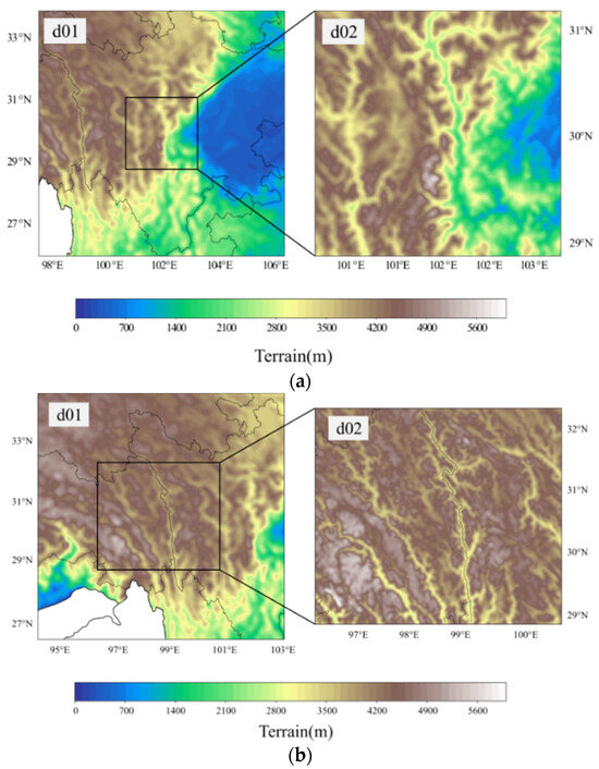 Ya’an, with a subtropical monsoon climate, is located in the western edge of Sichuan Basin. The area from Kangding to Litang belongs to the western Sichuan high mountain plain, with a wide and flat or hilly top surface, and mainly has a continental plateau-type and mountain-type climate. On the other hand, the area from Litang to Changdu belongs to the southeastern Tibetan Hengduan Mountains area, with high mountains, deep valleys, complex terrain, and mainly plateau climate. Since the terrain of Ya’an and Kangding is flatter and the climate is warmer than that of Litang Changdu, in order to adapt these differences, this paper divides the railway section from Kangding to Changdu into two regions with 100.8° E as the boundary and performs double-layer nested simulation. The outer grid is marked as d01, and the inner grid is marked as d02. Region 1 mainly includes Ya’an to Kangding and other places, and region 2 includes Litang to Qamdo and other places. The center points of the two regions are 30.03° N, 101.97° E and 30.6° N, 98.62° E, respectively. Figure 3 shows the specific simulation range.