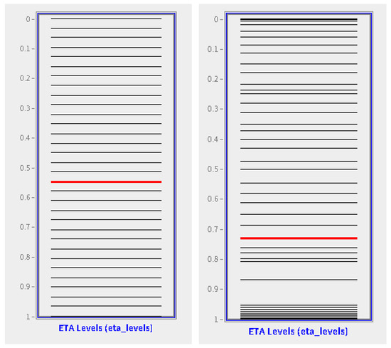 The National Centers for Environmental Prediction (NCEP) Final Operational Global Analysis (FNL) (https://rda.ucar.edu/datasets/ds083.2/ (accessed on 13 February 2023)) with a horizontal resolution of 1° × 1° and a frequency of 6 h are selected as the initial conditions of the model. The simulation covers the period from 12 December 2016 to 28 February 2017, and the specific grid parameters of the two regions are shown in Table 1. In region 2, which has many mountains, the simulation accuracy is improved by using MCD12Q1v006 land use data with a horizontal resolution of 500 m instead of the original data. Moreover, to simulate the atmospheric processes within the boundary layer more precisely, the vertical direction is divided into 41 layers, with 15 layers densely distributed at a height of about 1.5 km near the ground. Table 2 shows the heights of each layer grid, and Figure 4 illustrates the elevated layers in both regions, the red line shows the position of the 15th layer.