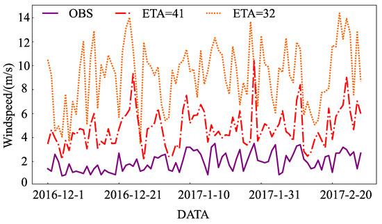 The source of all the meteorological data used in this paper is from the China Meteorological Administration (https://data.cma.cn/ (accessed on 12 December 2022)). These kinds of data have advantages of high accuracy and stability, but the data of each station only represent the surrounding information. Taking the daily average wind speed from December 2016 to February 2017 as the verification data, the physical parameter scheme of case3 in Table 3, the original land use data of the WRF model, and the two vertical stratification methods mentioned above are used to calculate the meteorological information of Litang. Table 4 shows the evaluation index results of the two schemes. The scheme of vertical layers densified near the ground has increased the correlation coefficient by 77.72%, reduced the mean bias by 61.13%, and reduced the root mean square error by 59.04% compared with the non-density scheme. Figure 5 shows the comparison of the change trends of the simulation results and the measured results. It can be seen that the change trend of the calculation results with vertical layers densified near the ground is more consistent with the measured results. Therefore, near-surface encryption can significantly improve the simulation results of the mountain wind field.