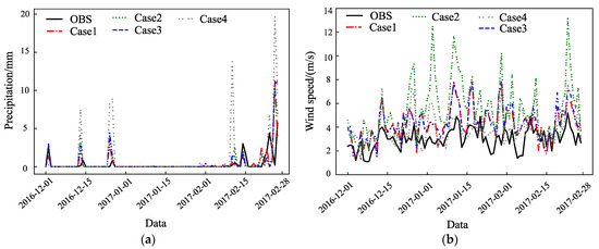 Comparison of simulation results in Kangding. (a) Comparison of precipitation result; (b) comparison of wind speed result.