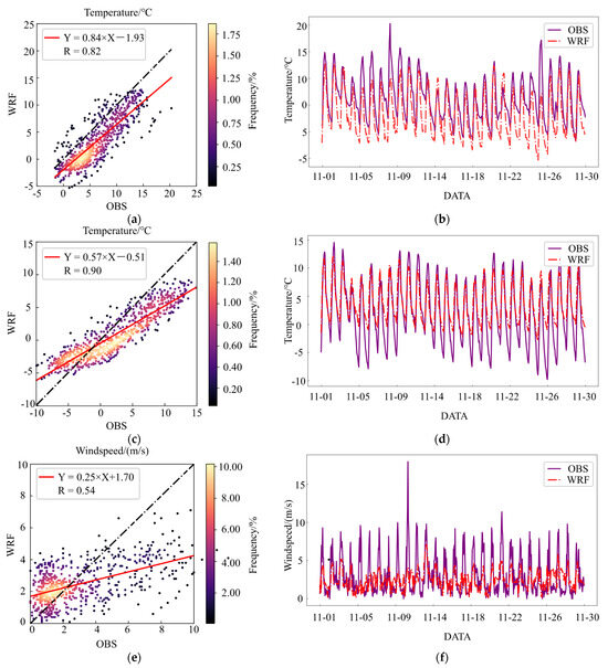 We performed linear fitting on the calculation results. The closer the points in the figure are to the diagonal line (the black dash line in figure), the closer the simulation results are to the real results. The brighter the color of the points, the more points fall in that area. Figure 7 shows the fitting results of temperature and wind speed calculation data and their changes over time. It can be found that the model can capture the temperature changes well. The simulated temperature of Kangding station is concentrated within 0 to 5 °C, and the temperature of Litang station is concentrated within −5 °C to 5 °C. The WRF simulation results of wind speed for both places are concentrated in 1–2 m/s. The simulation results of Litang station are higher than the actual recorded values; however, the WRF model accurately captured the change trend and extreme values of wind speed at both stations. Figure 8 shows the comparison between the rainfall calculation results and the actual results. The WRF model successfully captured the rainfall events. In summary, although there is some error between the data simulated by the WRF model and the actual data, the correlation of the simulation results is good, and it can accurately capture the change trend of the data, which also verifies the effectiveness of the simulation method.