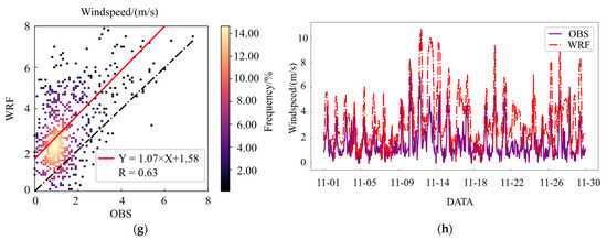 The results of the WRF fitting process and a comparison between the simulated and observed values. (a) The fitted line of temperature in Kangding; (b) the variation in temperature in Kangding; (c) the fitted line of temperature in Litang; (d) the variation in temperature in Litang; (e) the fitted line of wind speed in Kangding; (f) the variation in wind speed in Kangding; (g) the fitted line of wind speed in Litang; (h) the variation in wind speed in Litang.