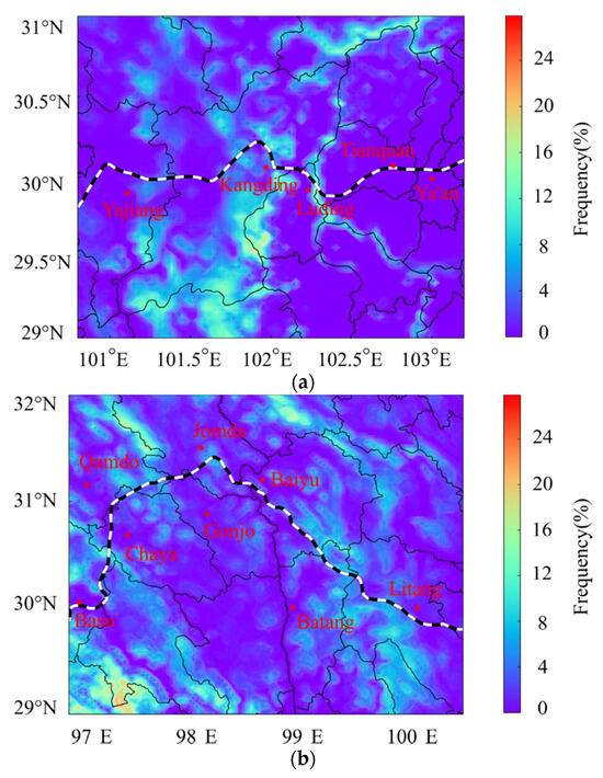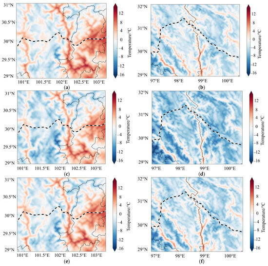 The output results of the inner grid d02 are analyzed to obtain the monthly average temperature within the simulated area, as shown in Figure 9a–f. The results show that a minimum temperature of −14 °C in the study area is calculated by the WRF model, which ensures that the snow particles do not degrade due to excessively low temperatures. The temperature distribution around the railway is relatively regular. Region 1 bounded by Kangding is divided into two parts. The eastern side of Ya’an City has warmer temperatures than the western side, and the average monthly temperature stays above 0 °C, which matches the sub-tropical humid monsoon climate of Ya’an City that does not have harsh winters. On the other hand, most areas on the western side of Kangding are colder, with an average monthly temperature of around −2 °C. These temperatures change with time, and the average temperature in January is lower than that in December and February. In region 2, along the railway from Litang to Qamdo, the temperatures are frigid, always below 0 °C. Notably, the temperature in January is significantly lower than that in December and February.