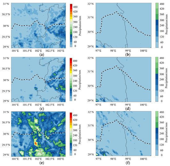 The distribution of cumulative precipitation in the simulation period. (a) Precipitation of region 1 in December; (b) precipitation of region 2 in December; (c) precipitation of region 1 in January; (d) precipitation of region 2 in January; (e) precipitation of region 1 in February; (f) precipitation of region 2 in February.