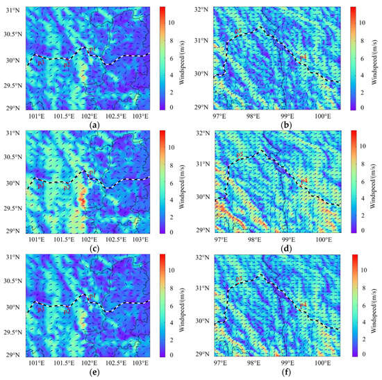 The distribution of average wind field in the simulation period. (a) Wind field of region 1 in December; (b) wind field of region 2 in December; (c) wind field of region 1 in January; (d) wind field of region 2 in January; (e) wind field of region 1 in February; (f) wind field of region 2 in February.