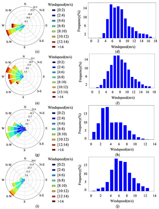 Wind rose diagram and the wind speed probability density graph. (a) the wind rose diagram of P1; (b) the wind speed probability density graph of P1; (c) the wind rose diagram of P2; (d) the wind speed probability density graph of P2; (e) the wind rose diagram of P3; (f) the wind speed probability density graph of P3; (g) the wind rose diagram of P4; (h) the wind speed probability density graph of P4; (i) the wind rose diagram of P5; (j) the wind speed probability density graph of P5.