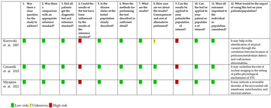 The critical appraisal only involved the retrospective studies by Kurowski et al. [70] and Cimarelli et al. [71] and the prospective study by Miyajima and colleagues [75] (Figure 2). Case reports and case series were not considered as a part of this process. All the analyzed studies satisfied at least 8 of the 11 domains but showed high risk in two domains. One of the major concerns with the selected papers was represented by the lack of a reference standard, as the diagnosis of TTC is based on specific diagnostic algorithms rather than a single test. In addition, the absence of an adequate follow-up limited the evaluation of patients’ outcomes in one study. Finally, it was found there was a level of high concern of the applicability in evaluating the possibilities of the application of the reported results. However, cumulatively, the quality appraisal result was quite good.