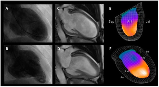 A case of inverted/reverse/basal TTC. Left ventriculography ((A): diastolic phase; ((B): systolic phase) and cardiac magnetic resonance imaging ((C): diastolic phase; (D): systolic phase) show a depressed systolic function with dyskinesia of the basal and middle segments (Figure: (A–D)) and hyperkinesia of apex and para-apical areas (Figure: (A–D)). Figure (E,F) show an increased adrenergic receptor activity in the apical side of the left ventricle, with simultaneous reduction in the basal region to the 123I-mIBG scintigraphy [83].
